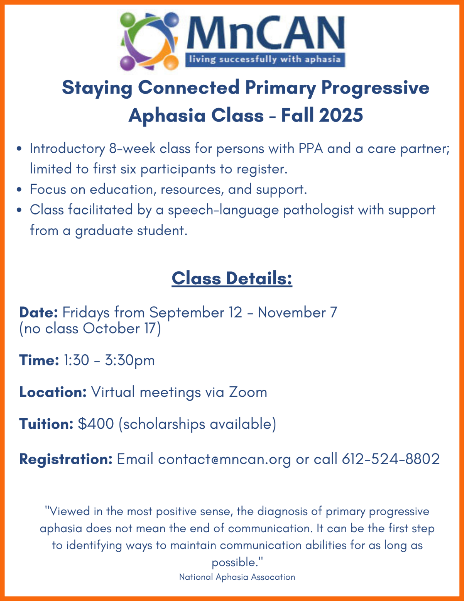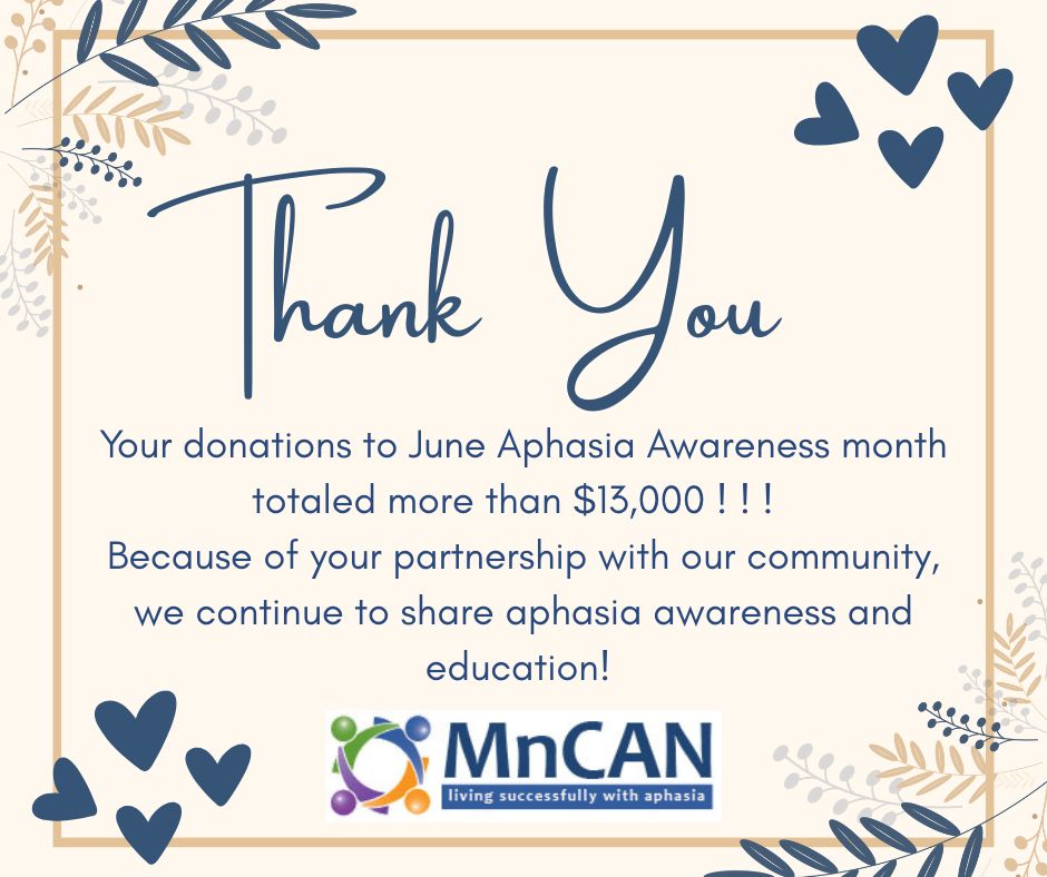 Because of you, MnCAN is able to continue fulfilling its mission -supporting communication, connection, and community for those living with aphasia and PPA.