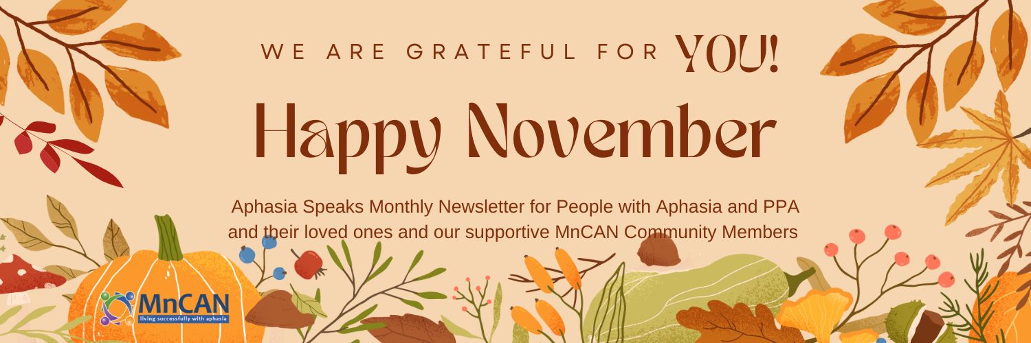 November Reflections: Gratitude Hello friends, As we move into the holiday season, we are reminded of how powerful connection and conversation are in everyday activities. This time of year brings gatherings, traditions, and moments with loved ones — but for people living with aphasia or primary progressive aphasia, it can also bring unique challenges. We believe that everyone deserves to be part of meaningful conversations and participate in life at the dinner table, celebrations, and everyday life. As you reflect on gratitude and giving this November, we invite you to connect with us through a program, donation or community event.