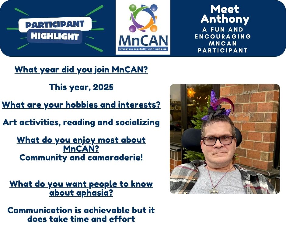 Together, we can make sure every person with aphasia or primary progressive aphasia knows they are not alone, we are here to support them through all seasons of the journey. Warmly, The MnCAN Team Jessica Wald and Angie Maier, Executive Directors and Speech Language Pathologists, along with the MnCAN Board of Directors, Group Facilitators and Students/Volunteers