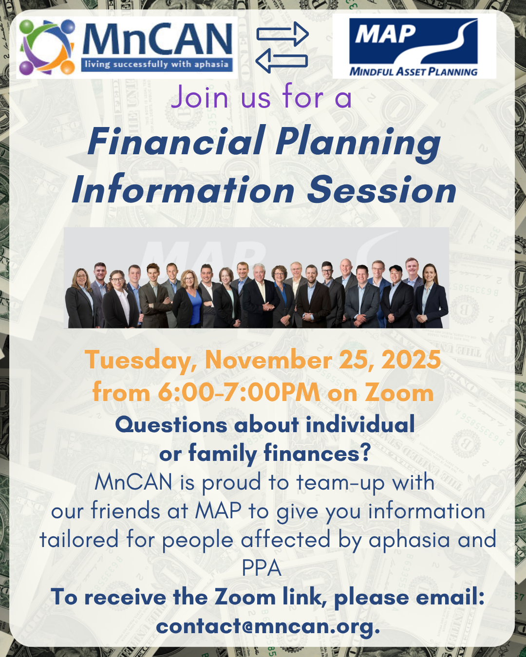 Longtime MnCAN donors and Mindful Asset Planning founders, Steve and Susan Zimmerman, along with their incredible leadership team, have generously offered to host a special informational session on financial planning. Learn valuable insights about planning for your financial future when your life plans have shifted due to a diagnosis of stroke, aphasia, or PPA, while supporting MnCAN’s mission. To register, email us at contact@mncan.org. We hope to see you there, you won't want to miss this informative event! |
